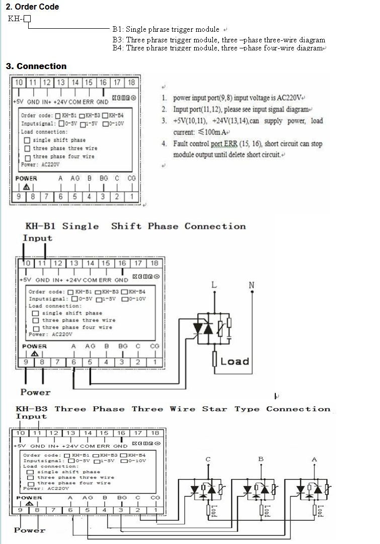 KH series SCR( thysitor ) phrase trigger module is suitable for continuing adjusting voltage for kinds of load signal phrase 220V and three 380V. The module can receive the standard control signal of meter without connecting external synchronous booster or can manual adjusting with connecting external potentiometer.