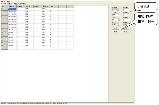 a、 添加設(shè)備:在界面右邊,選擇設(shè)備名稱,輸入設(shè)備地址、工位號、通道號、單位和記錄間隔,并選擇通訊串口和通訊波特率。其中,設(shè)備地址和通道號只能輸入數(shù)字。通訊波特率必須和下位機的波特率一致。點擊“添加”,添加設(shè)備成功并在左邊設(shè)備列表中最后一行顯示添加的新設(shè)備的信息。添加完所有設(shè)備后,記得要點擊“保存”按鈕,否則將不保存添加的設(shè)備信息。