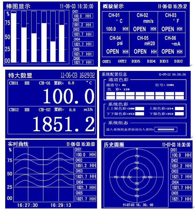 KH300AB智能小型藍屏無紙記錄儀(96×96mm最多6通道輸入),為藍屏液晶顯示。儀表具有全隔離萬能輸入功能,可輸入標準電流、標準電壓、毫伏、熱電阻、熱電偶等信號于一體;可提供通訊、打印、報警、饋電輸出等功能。儀表具有流量累積、溫壓補償功能;具有強大的顯示功能,高精度棒圖顯示、實時中圓圖顯示、歷史圓圖追憶、實時曲線顯示、歷史曲線追憶、報警狀態顯示,同時可直接查詢年、月、日、時、分、秒的數據,快捷方便,頁面刷新速度小于1秒。使用RS485、RS232通訊,標準MODBUS-RTU協議,可與組態王、MCGS等專業軟件進行組態;數據可直接通過任意U盤導出,U盤即插即讀,無需任何操作;分析軟件可導出EXCEL數據格式或曲線格式,直接打印即可。