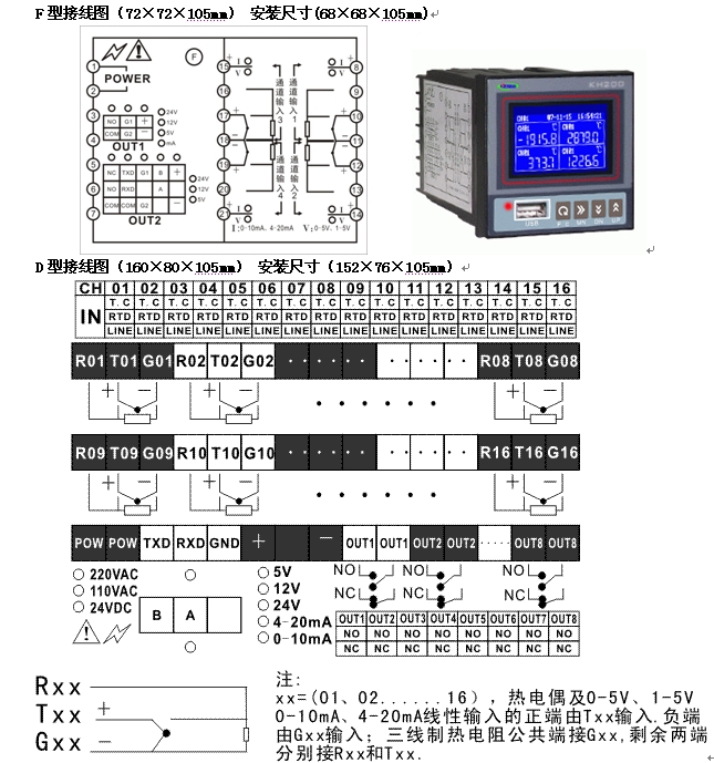如:有一臺(tái)表的型號(hào)是:KH204BD-2RIA-P-U-I1;主機(jī)型號(hào):KH204BD,外型尺寸:160×80mm,4通道小型藍(lán)屏無紙記錄儀,萬能輸入,帶兩個(gè)繼電器報(bào)警輸出,帶一路RS232打印接口,帶一個(gè)USB接口,帶一路變送輸出, AC220V電源。