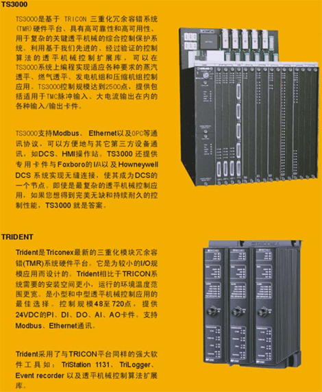 TRICON冗余容錯控制系統為工業過程中要求最大安全與連續生產的關鍵控制提供了一種最佳選擇。化工、石油、天然氣、造紙、和電力能源等方面的先導企業已成功地使用TRICON容錯控制系統用以提高安全性、增加產量和減少停車次數。